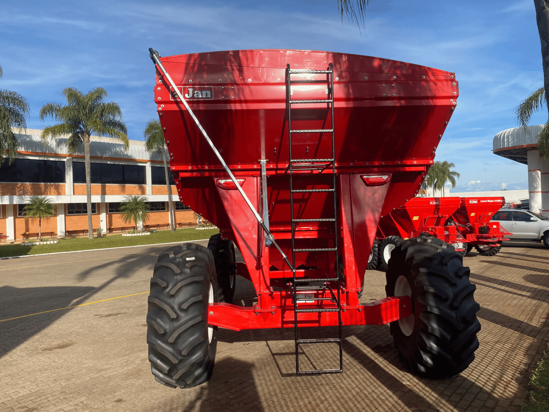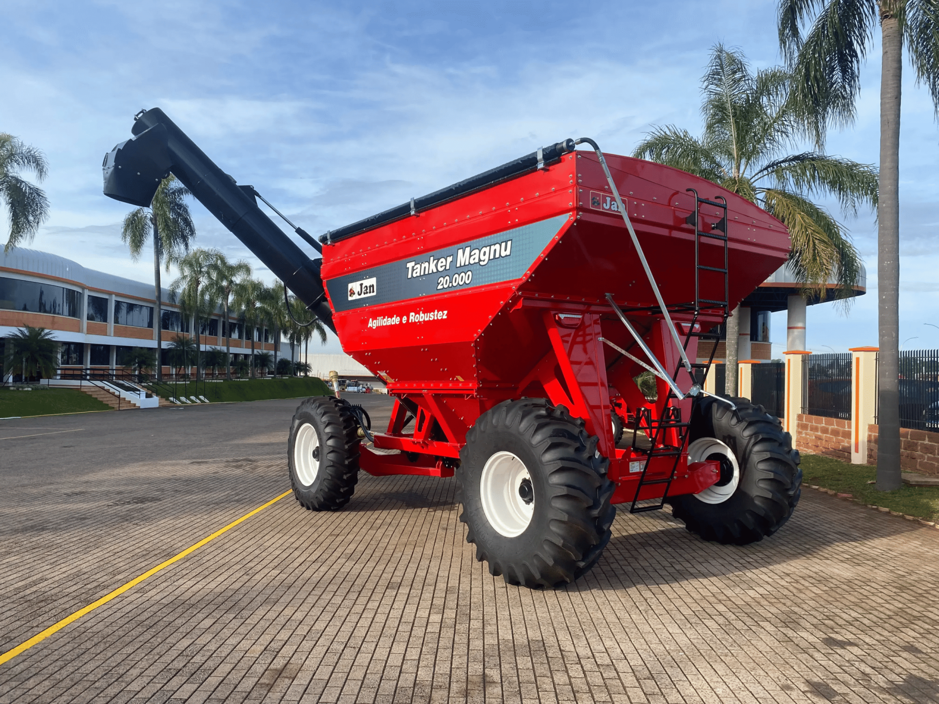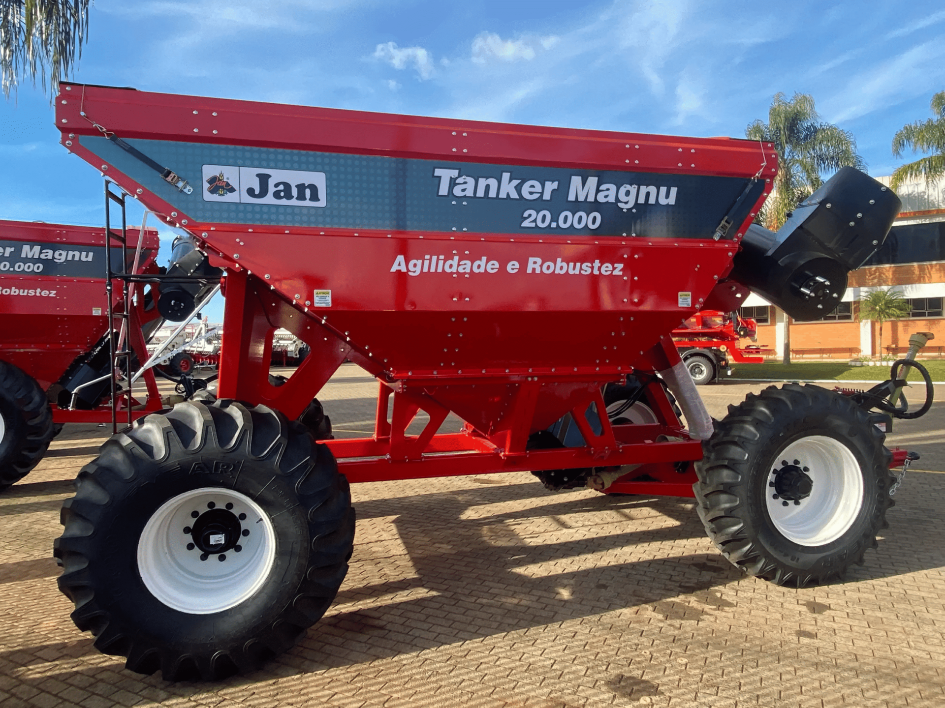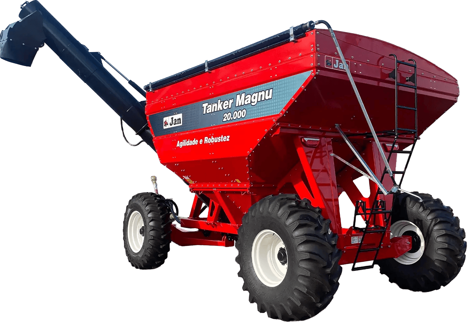 Tanker Magnu 20.000 Tubo Frontal 4 Rodas, fabricada pela JAN, é projetada para **Citation: médias propriedades agrícolas que buscam eficiência no transporte e transbordo de grãos com máxima estabilidade. Com capacidade volumétrica de 20.000 litros (equivalente a 250 sacas de soja), esta carreta graneleira destaca-se pelo seu tubo de descarga frontal de 475 mm, que proporciona melhor visualização durante a descarga e facilita manobras em espaços reduzidos. Sua capacidade de descarga de 180 sacas por minuto reduz o tempo de operação para apenas 1 minuto e 23 segundos, aumentando o rendimento da colhedora em até 25%.