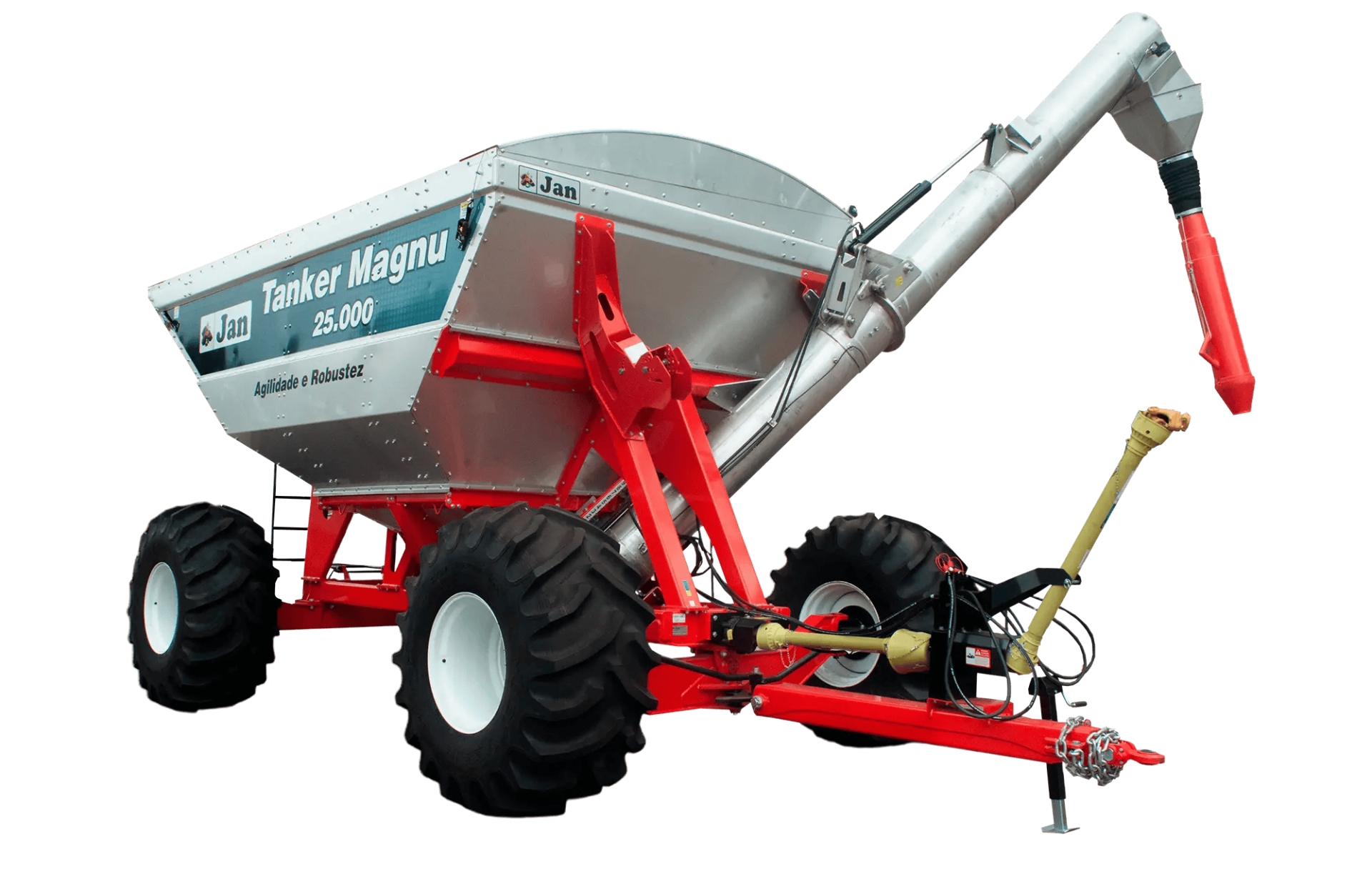 Construída com um depósito em aço inox desmontável e equipada com uma sobrecaixa articulada para facilitar o transporte, a Tanker Magnu 25.000 Inox combina resistência à corrosão, agilidade e estabilidade superior graças ao seu rodado com 4 rodas. Equipada com roscas sem-fim temperadas, tampas de regulagem de fluxo com guias de madeira, bocal articulado e sistema hidráulico, esta carreta garante segurança e facilidade de manutenção, sendo ideal para culturas como soja, milho, trigo, sorgo e arroz, além de abastecimento de fertilizantes.