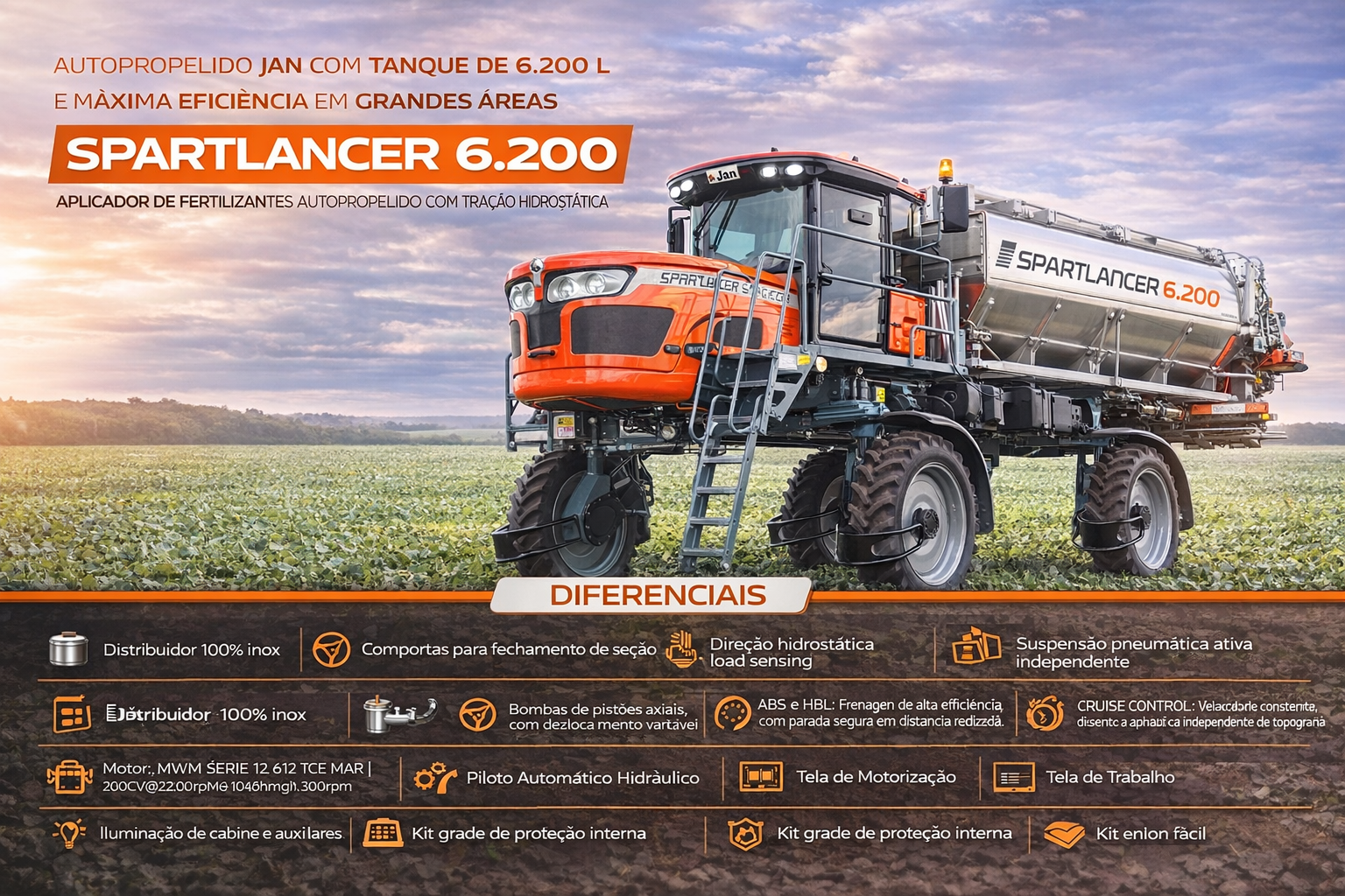 O Spartlancer 6.200 JAN é o autopropelido com 6.200 L de capacidade, faixa de distribuição de até 42 m e alta tecnologia embarcada. Produtividade sem limites para grandes propriedades.