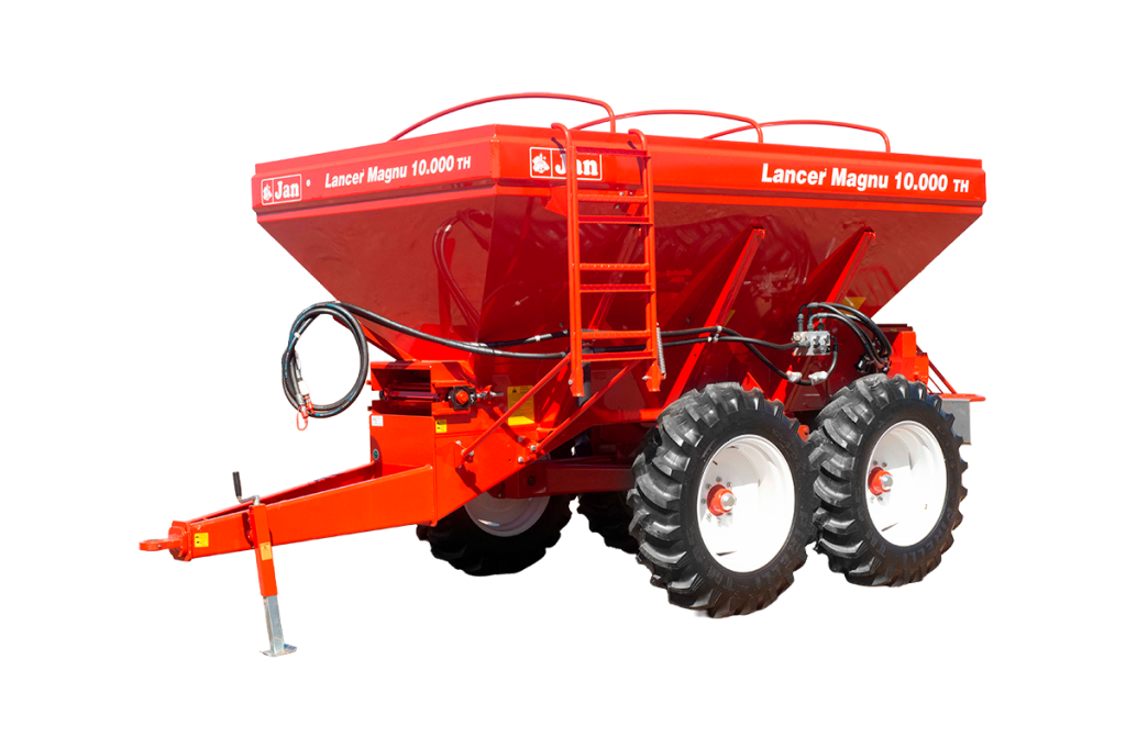 O Lancer Magnu 10.000 Plus TH JAN une estrutura reforçada com transmissão hidráulica independente, garantindo alta durabilidade e distribuição precisa até 36 m.