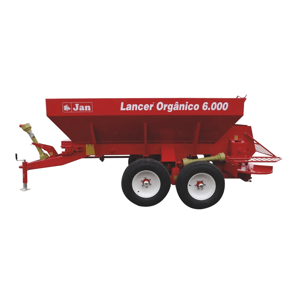 O Lancer Orgânico  6.000 da JAN distribui esterco, torta, gesso, calcário e outros insumos com alta produtividade em faixas de 10 a 16 m. Esteira dupla e funil específico oferecem performance robusta para grandes demandas.