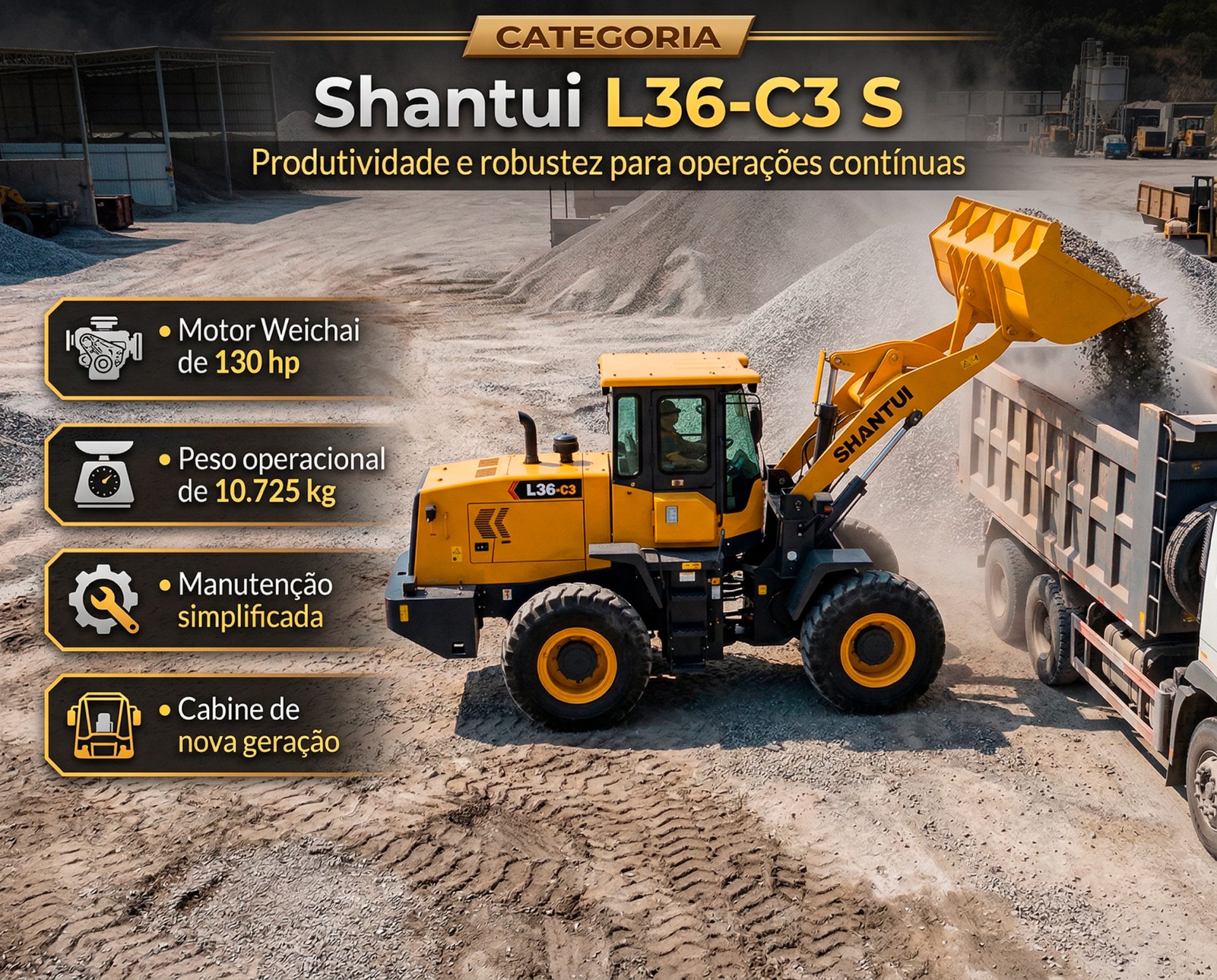 A Shantui L36-C3 S, distribuída pela Centro Oeste Implementos, é uma pá carregadeira de médio porte projetada para oferecer alta eficiência e versatilidade em operações de agricultura, silvicultura e construção.
