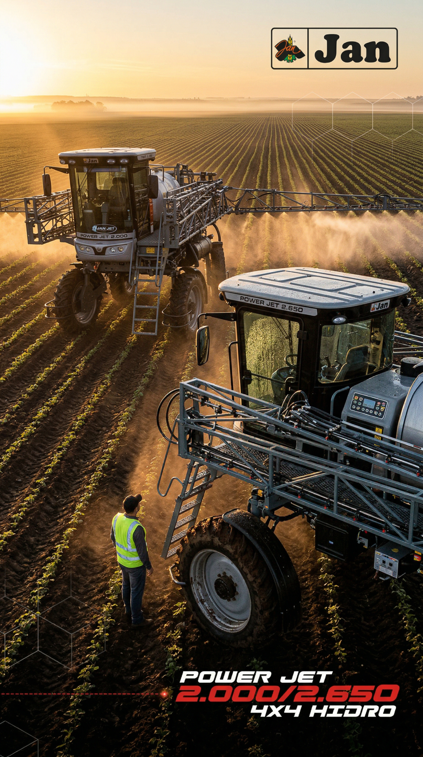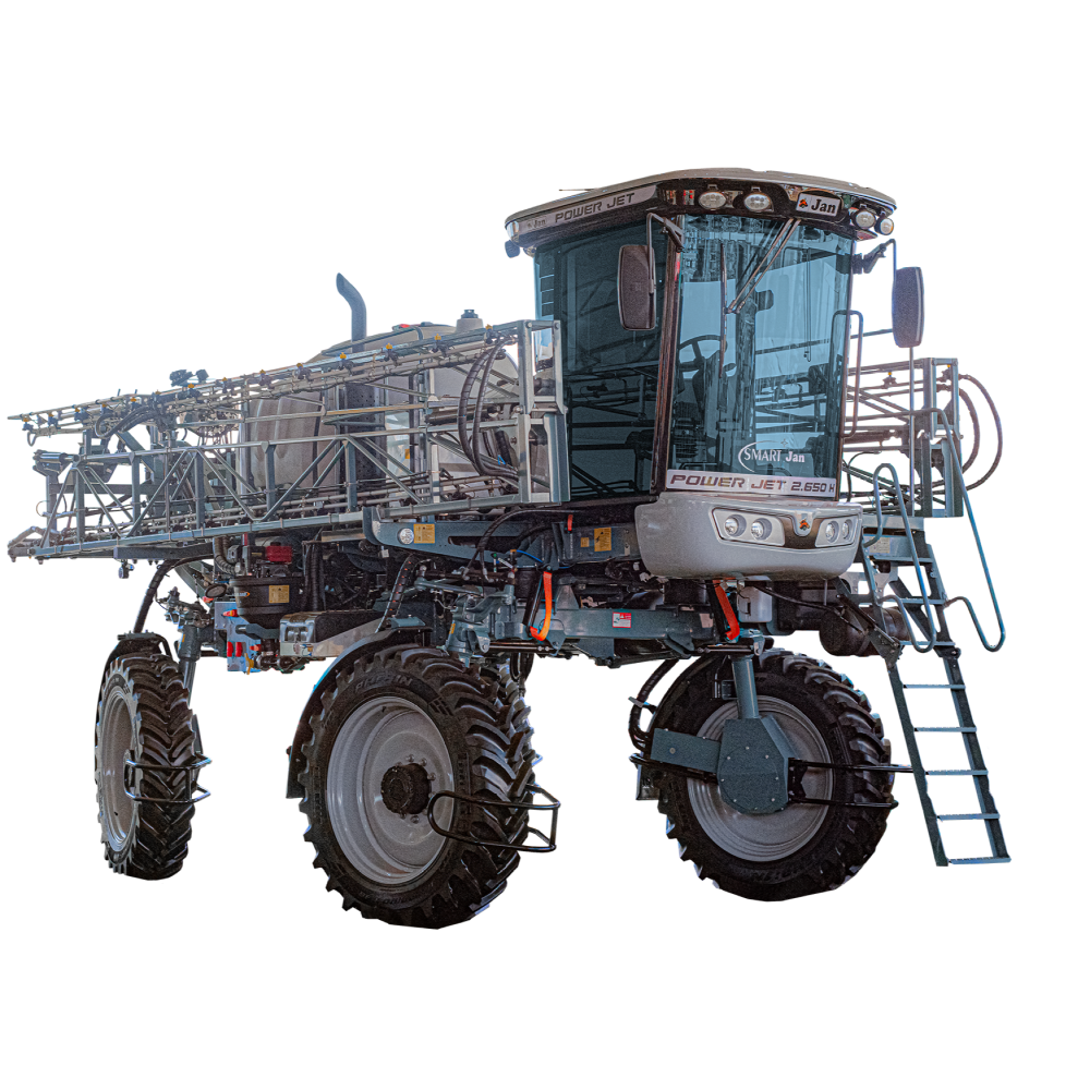 O Power Jet 2.650 Hidro, fabricado pela JAN, é um pulverizador autopropelido projetado para médias e grandes propriedades agrícolas que buscam alta eficiência, economia de insumos e precisão na aplicação de defensivos. Com um tanque principal de 2.650 litros e tração 4×4 hidrostática Bosch Rexroth, este modelo garante estabilidade superior em terrenos variados e manobras precisas graças ao piloto automático hidráulico e à direção hidrostática load sensing.