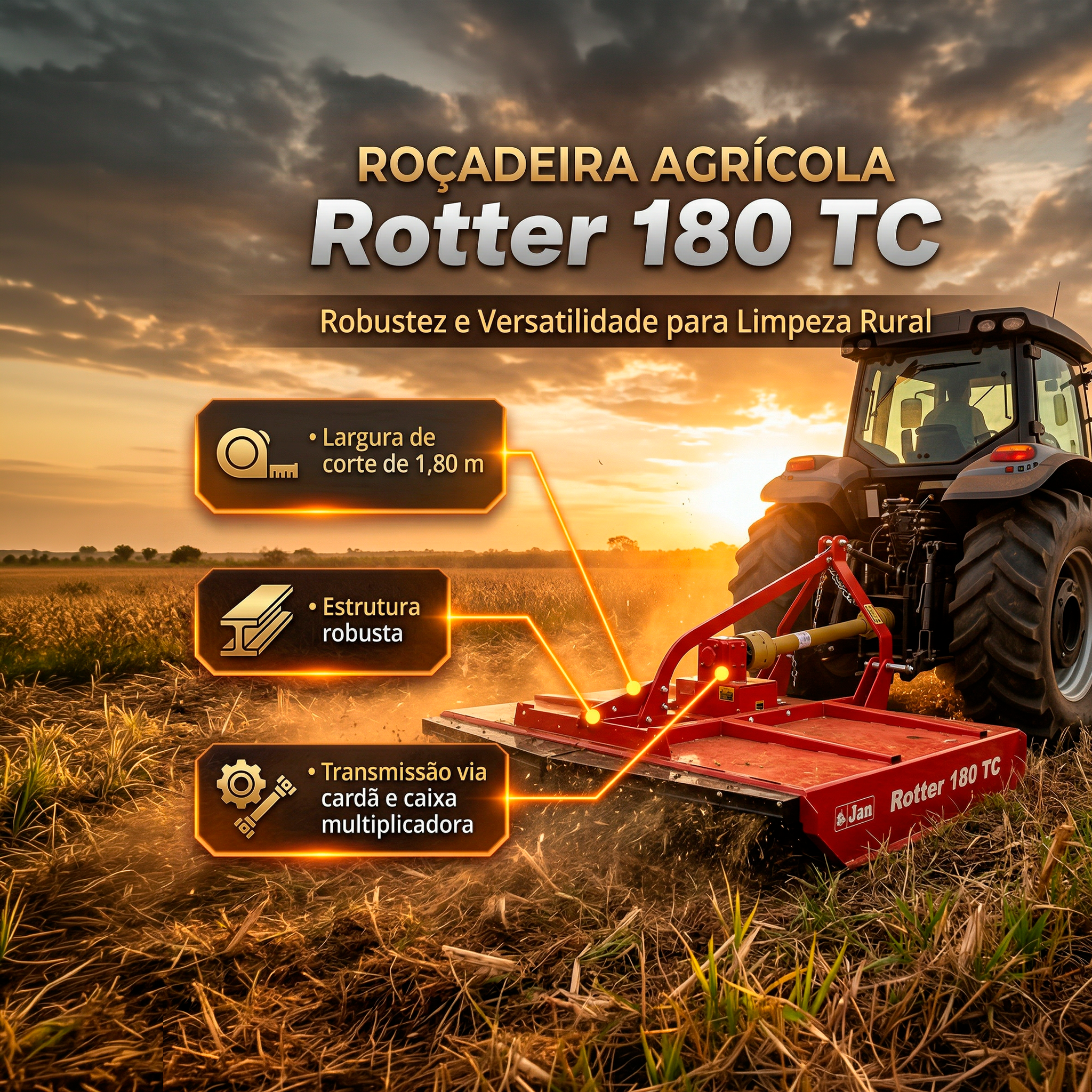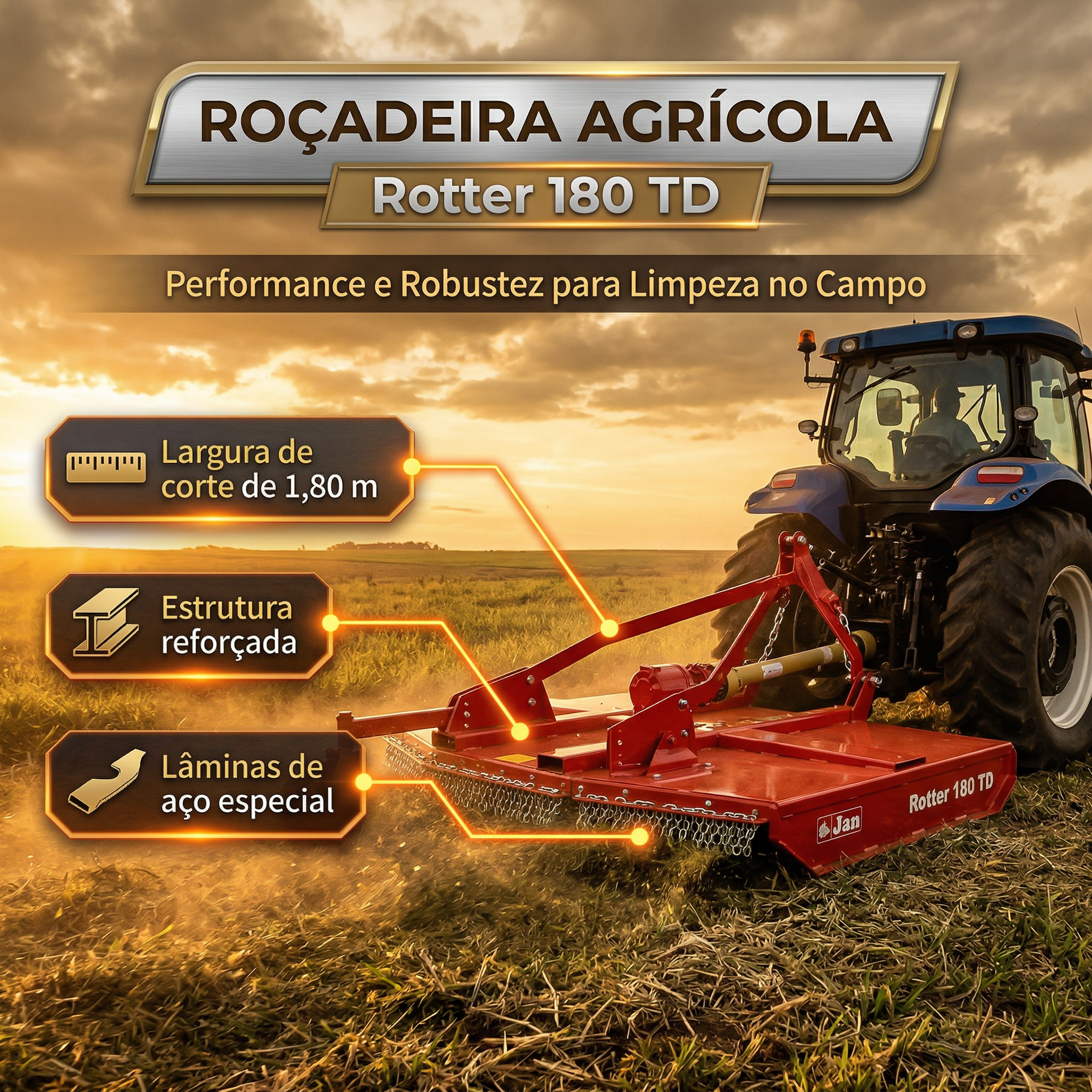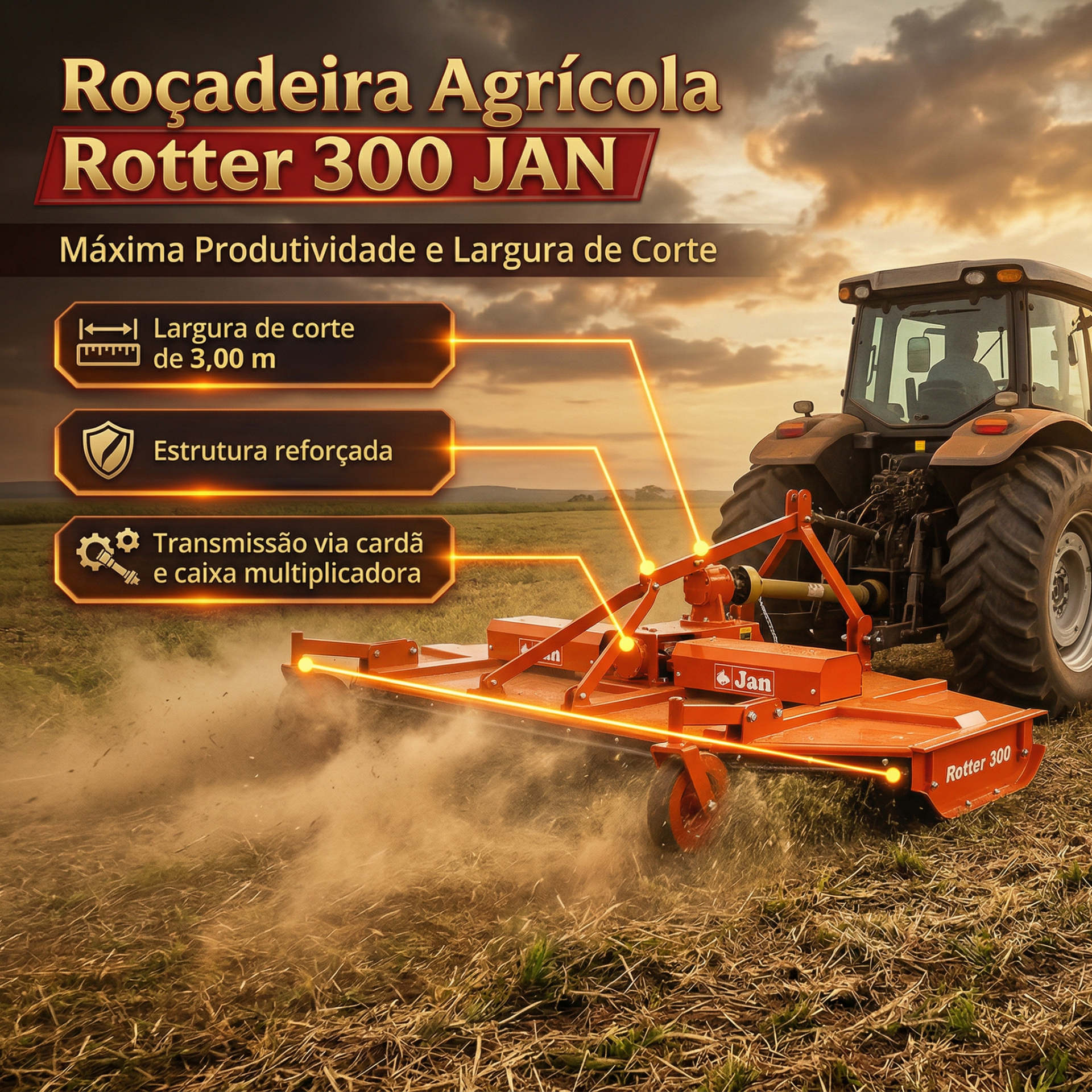 A Rotter 300 é o modelo topo de linha da JAN em roçadeiras agrícolas, desenvolvida para produtores e empresas que exigem máximo rendimento operacional e robustez incomparável. Com sua impressionante largura de corte de 3,00 m, é a escolha perfeita para quem precisa cobrir grandes áreas em menos tempo, garantindo eficiência e economia de combustível.