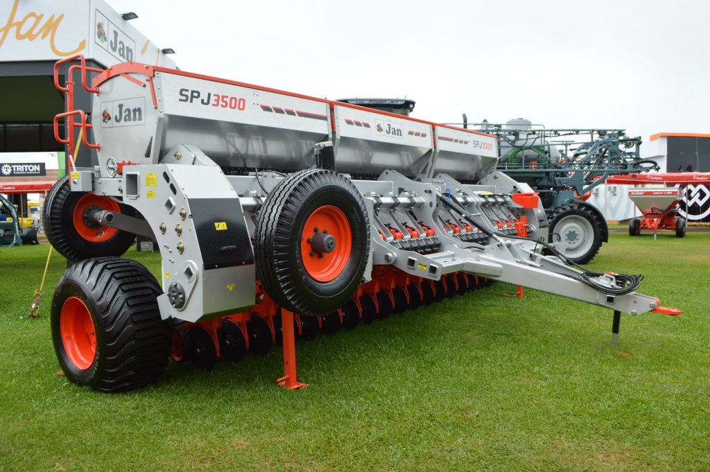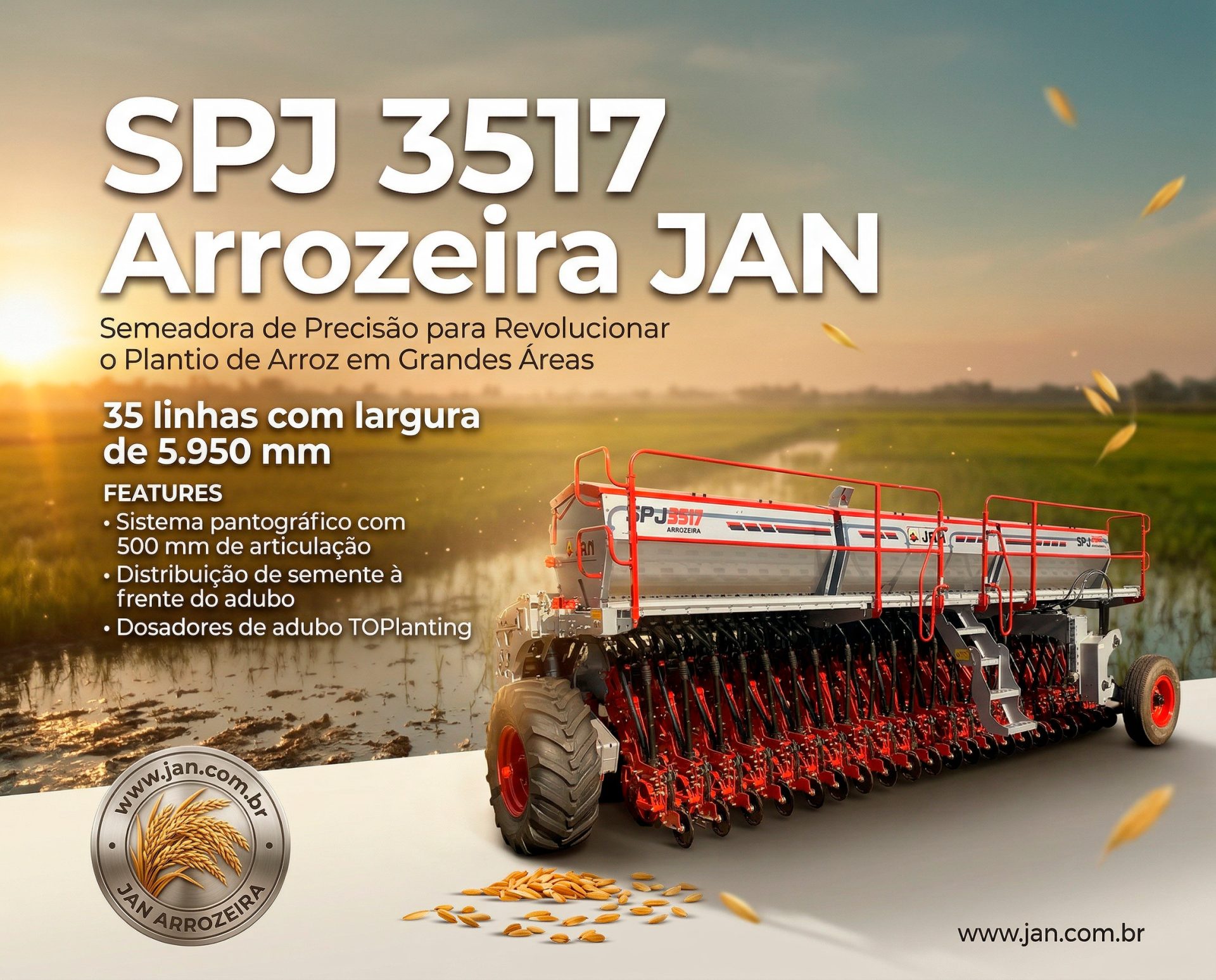 A SPJ 3517 Arrozeira, fabricada pela JAN, é a semeadora de precisão definitiva para grandes propriedades agrícolas dedicadas ao plantio de arroz sequeiro. Projetada para enfrentar os desafios de terrenos com taipas e topografias onduladas, ela oferece 35 linhas com espaçamento de 17 cm, alcançando uma largura de trabalho de 5.950 mm a maior da linha SPJ.