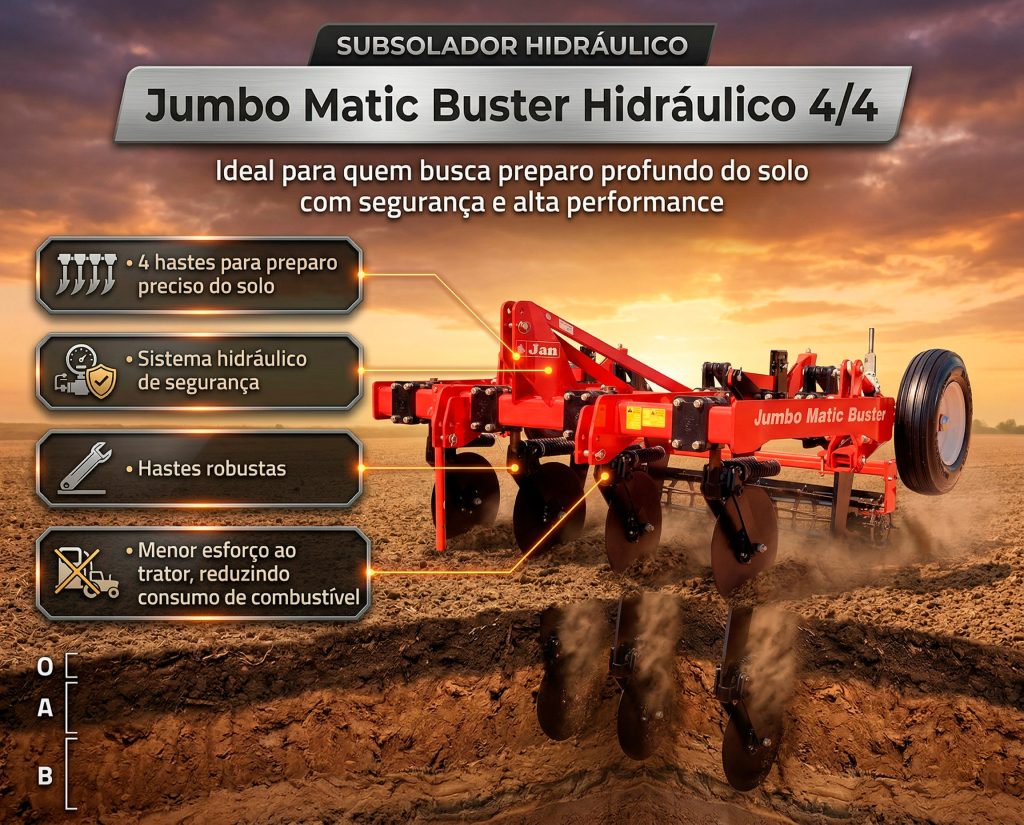 O Subsolador Jumbo Matic Buster Hidráulico 4/4 da JAN quebra camadas compactadas do solo, aumenta a produtividade e reduz custos no preparo agrícola.