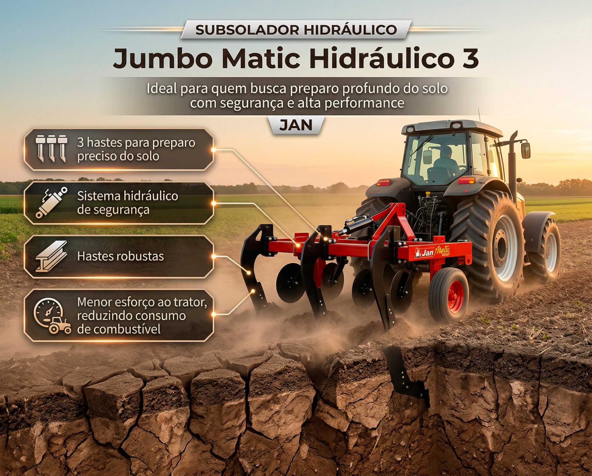 O Jumbo Matic Hidráulico 3 da JAN oferece preparo profundo do solo com 3 hastes e sistema hidráulico para levantar os braços em caso de obstáculos, garantindo eficiência e segurança.