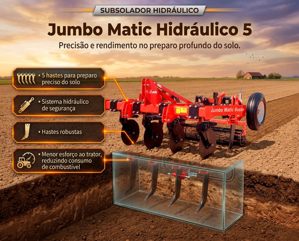 O Jumbo Matic Hidráulico 5 da JAN oferece 5 hastes para preparo profundo do solo, com sistema hidráulico de segurança que eleva automaticamente as hastes em caso de obstáculos, garantindo eficiência e proteção.