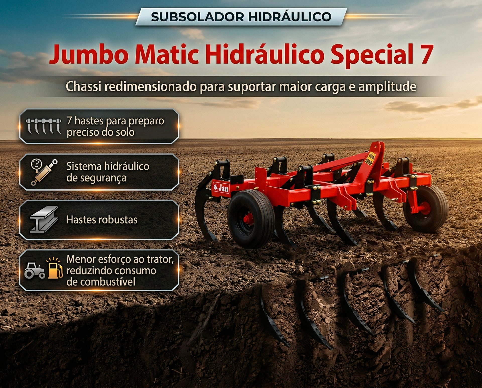O Jumbo Matic Hidráulico Special 7 da JAN, com 7 hastes reforçadas e sistema hidráulico de segurança, oferece preparo profundo do solo em grandes áreas, garantindo robustez, eficiência e economia operacional.