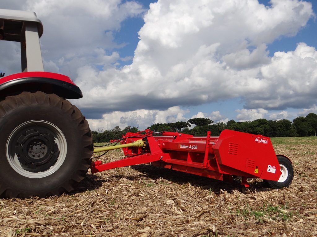 Tritton 4.600 da JAN é o maior triturador da linha, com 4,60 m de largura, ideal para grandes áreas e volumes elevados de resíduos culturais. Eficiência e potência no campo.