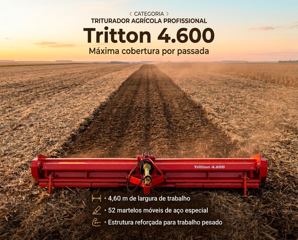 O Tritton 4.600 foi desenvolvido para atender produtores e operações agrícolas que demandam máxima produtividade e eficiência operacional. Com sua impressionante largura de trabalho de 4,60 m, este modelo entrega o maior rendimento por passada da linha Tritton, sendo ideal para grandes áreas, usinas, lavouras de milho, cana, algodão, pastagens e outras culturas de larga escala.